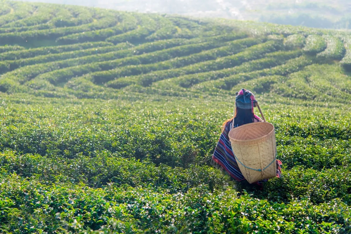 採摘茶葉之方法視茶園經營方法而異,但通常以一芽二葉為標準,亦常有採至第三葉者。採摘茶葉多用手操作,因便於選擇適當之葉而採之。採茶工人肩背竹製茶籃,將採得之茶葉放於籃內,待茶葉裝滿後,隔一定時間(通常一日三次)將其運返工廠以待萎凋。